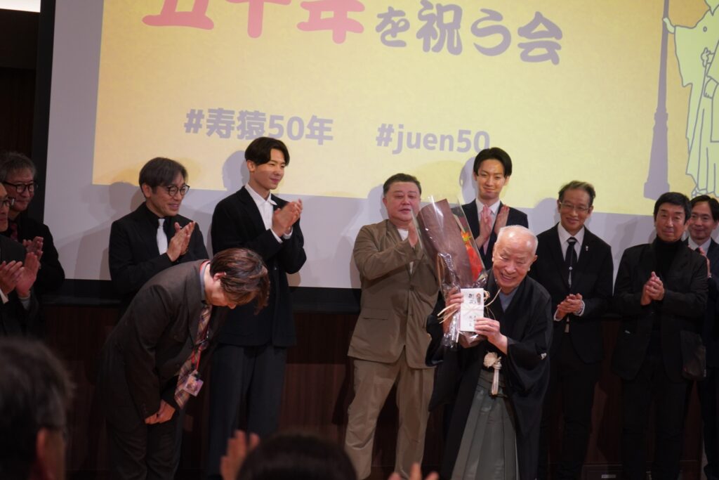 澤瀉屋一門が一堂に会し、「生ける伝説」とも呼ぶべき寿猿さんの半世紀を祝うために集まった特別な夜です。